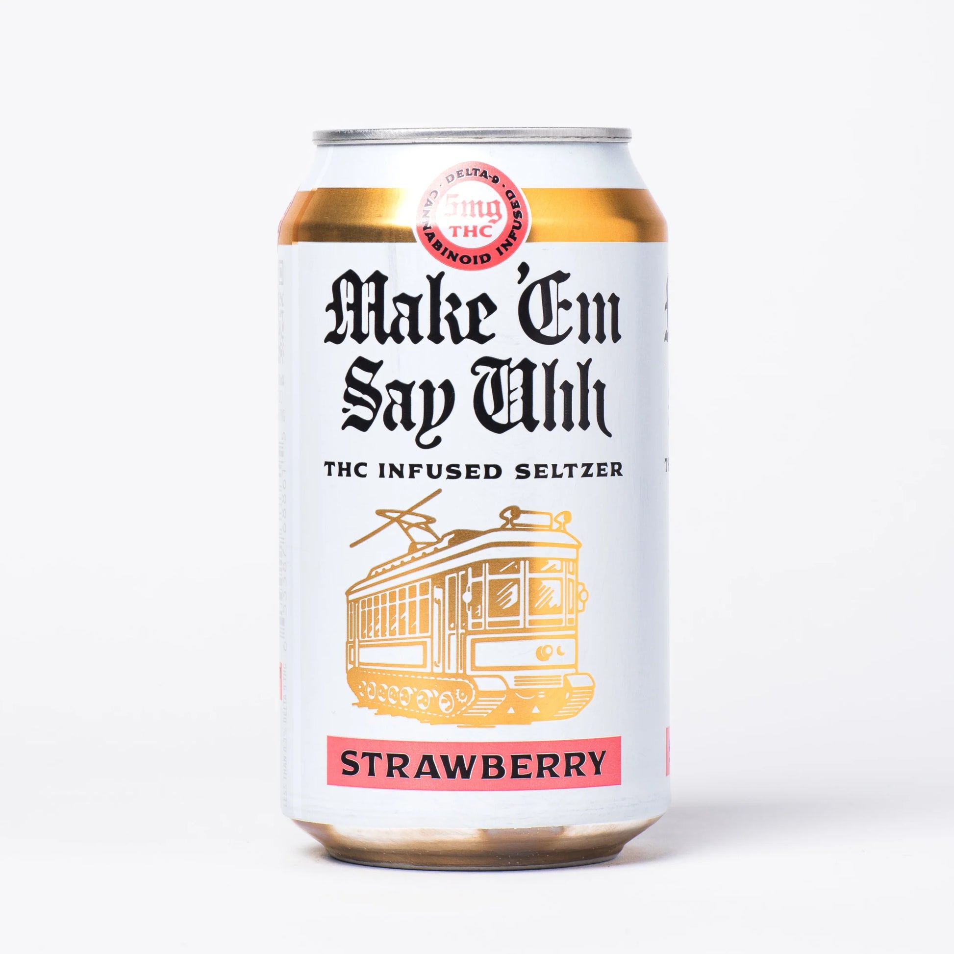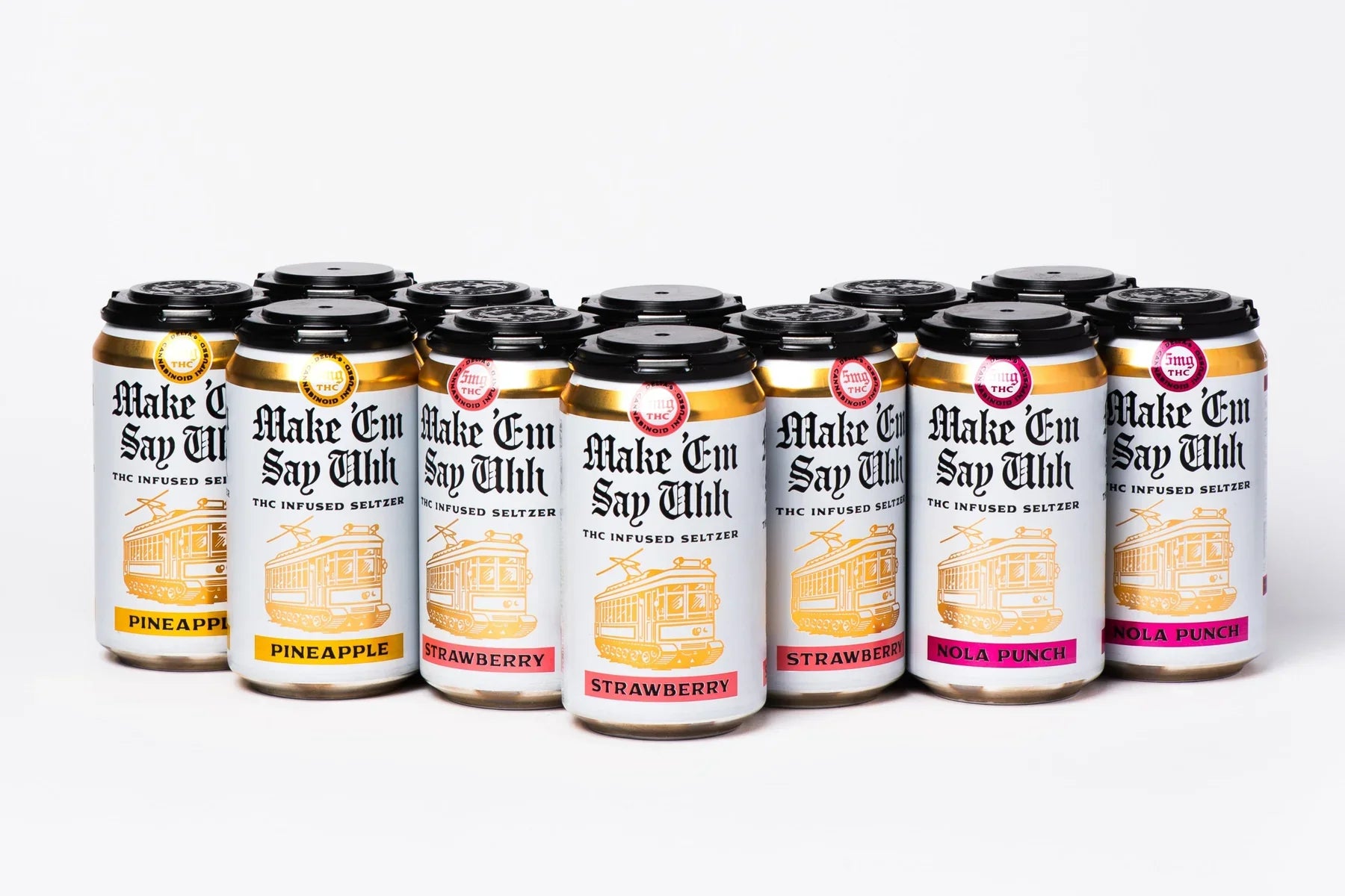 Make 'Em Say Uhh is a THC seltzer with 5mg Delta-9 THC per can, offering fast effects within 10–15 minutes thanks to Nano THC for quick absorption. It’s discreet, odorless, and ideal for social occasions without alcohol’s downsides. Available in Strawberry, Pineapple, and NOLA Punch flavors.